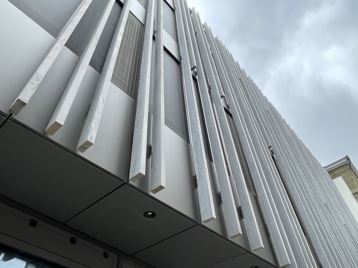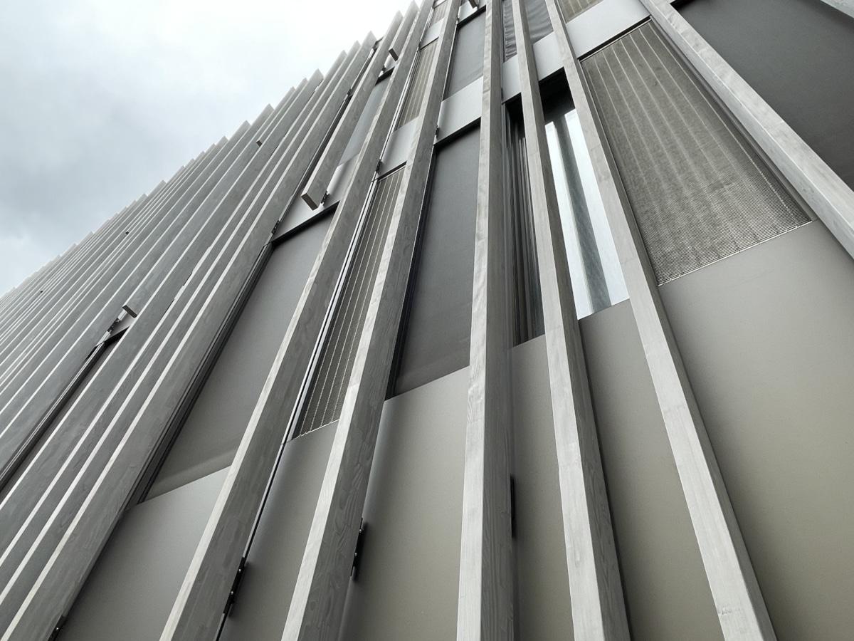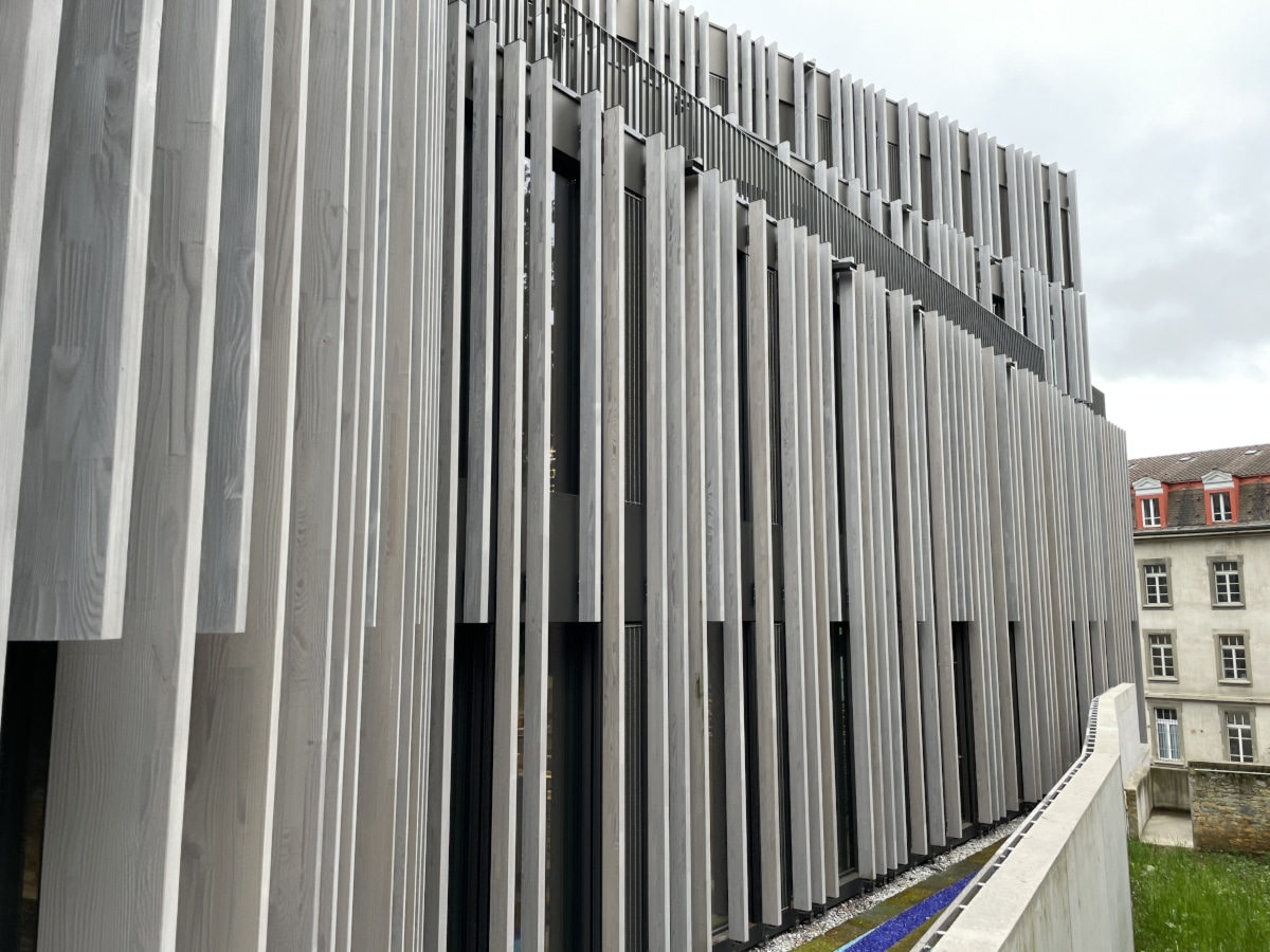 Structure en aluminium et acier inoxydable, porteuse de la nouvelle façade habillée de lames verticales en bois.