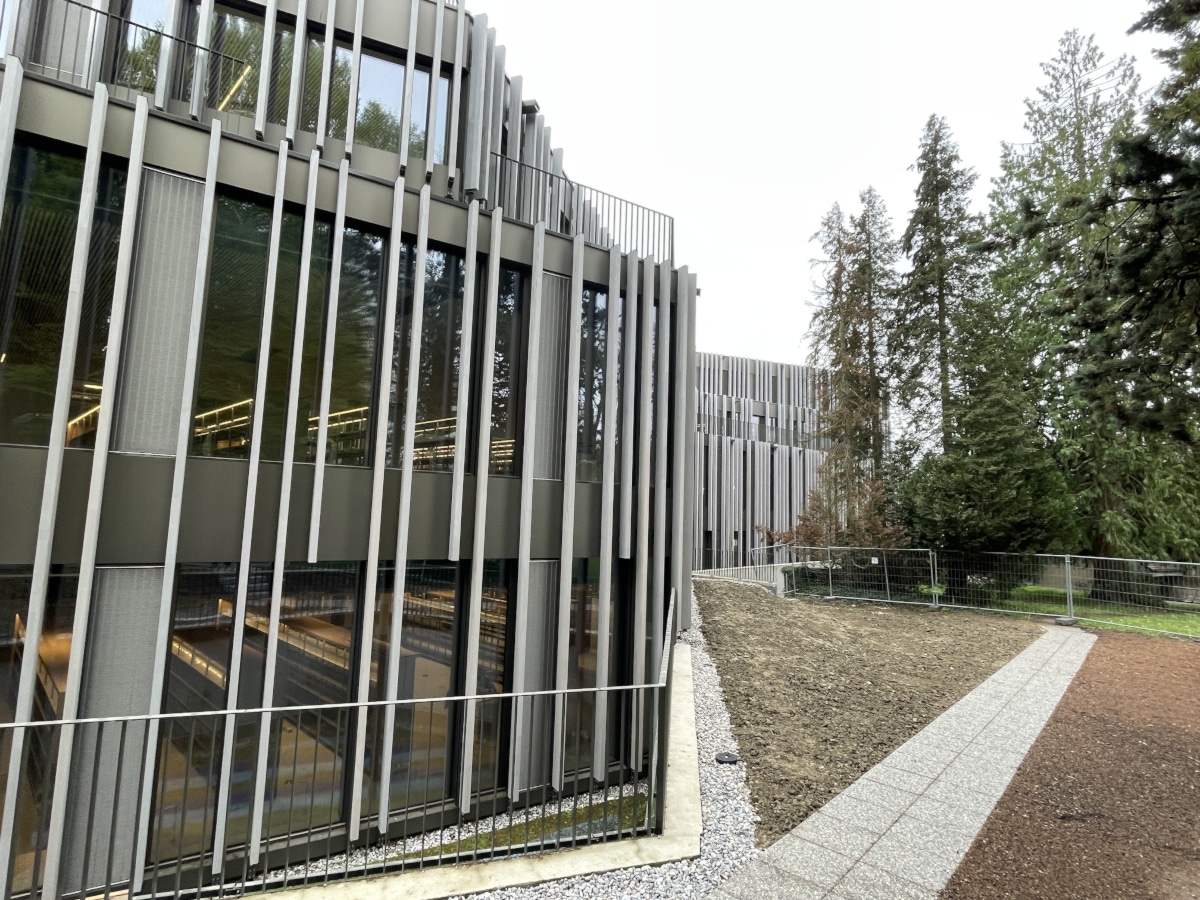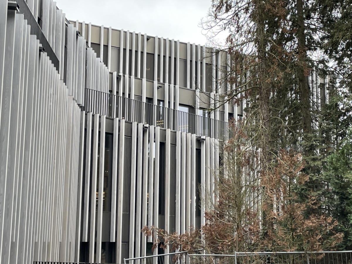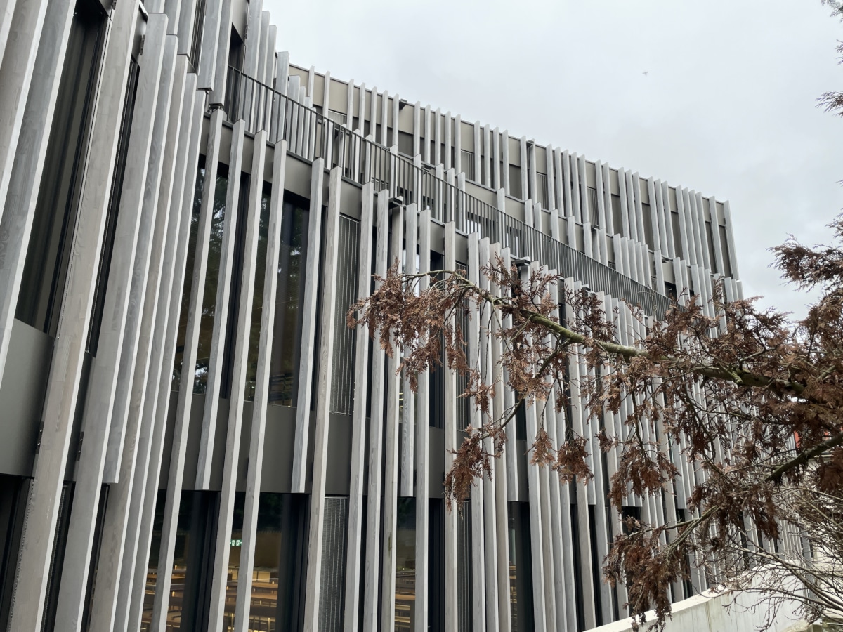Structure en aluminium et acier inoxydable, porteuse de la nouvelle façade habillée de lames verticales en bois.